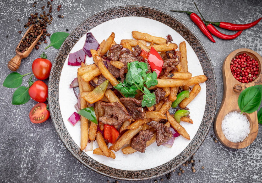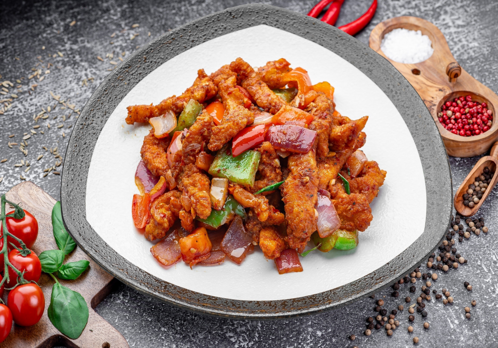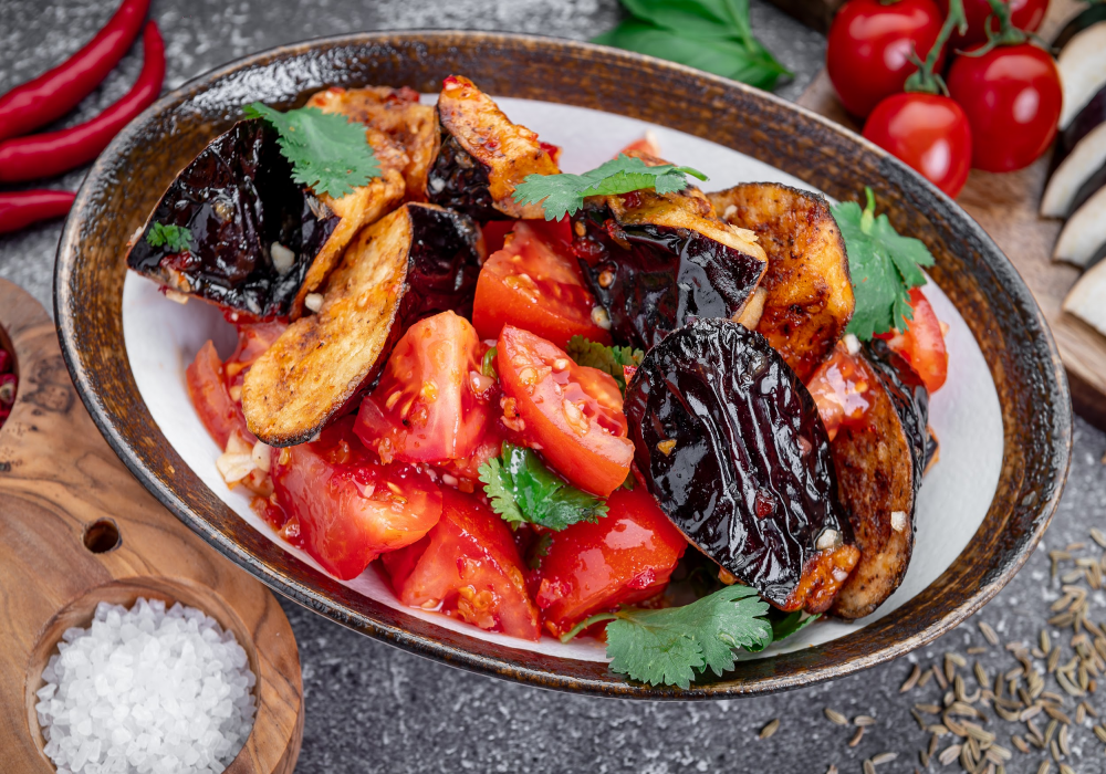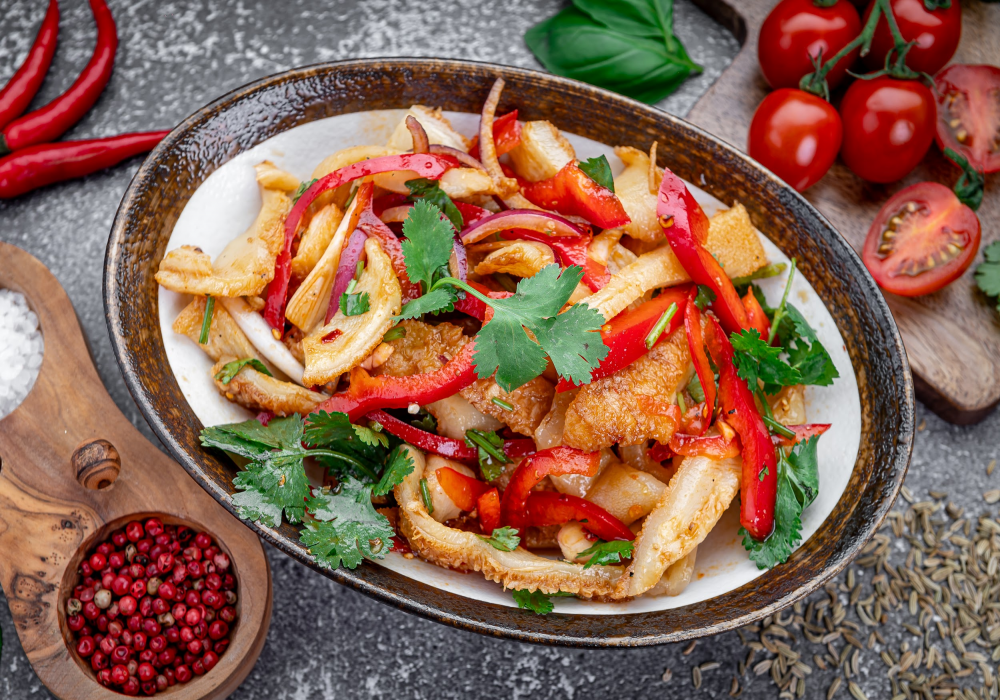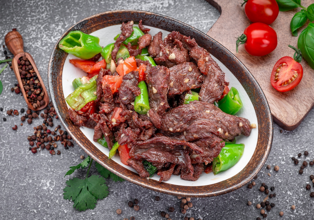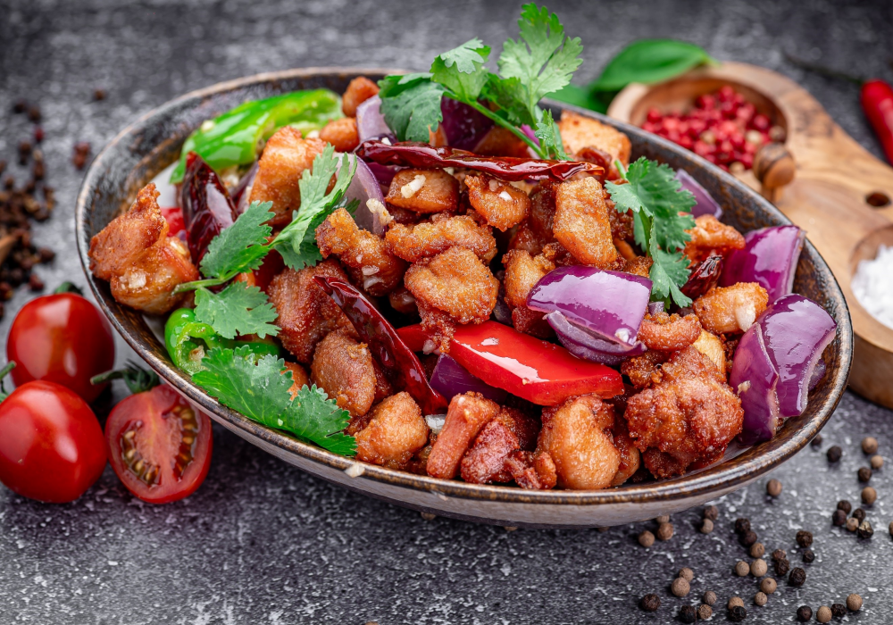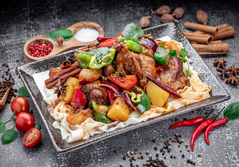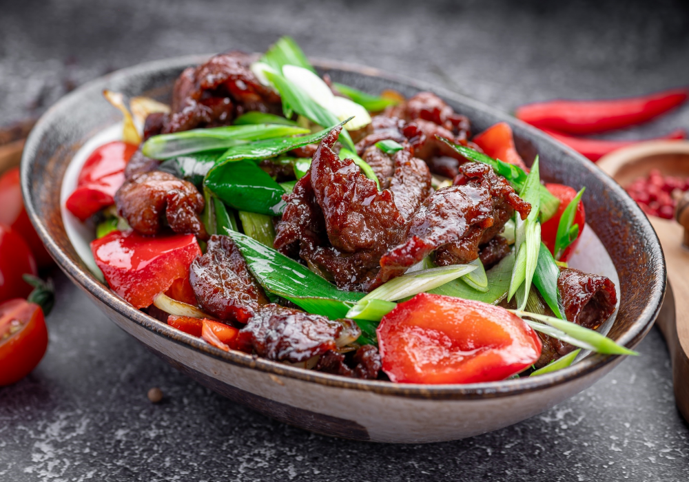 1Stir fried lamb with spicy pepper, tomato, cilantro & peppercorn oil