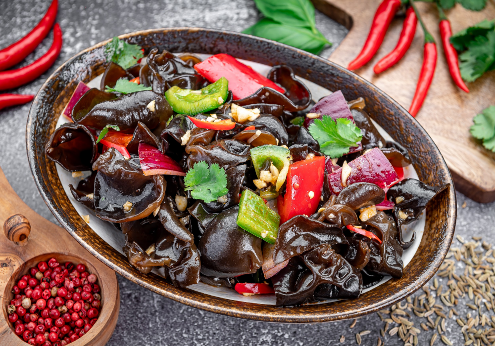 1Black fungus, red & green peppers, garlic, onion cilantro sesame oil, vinegar dressing