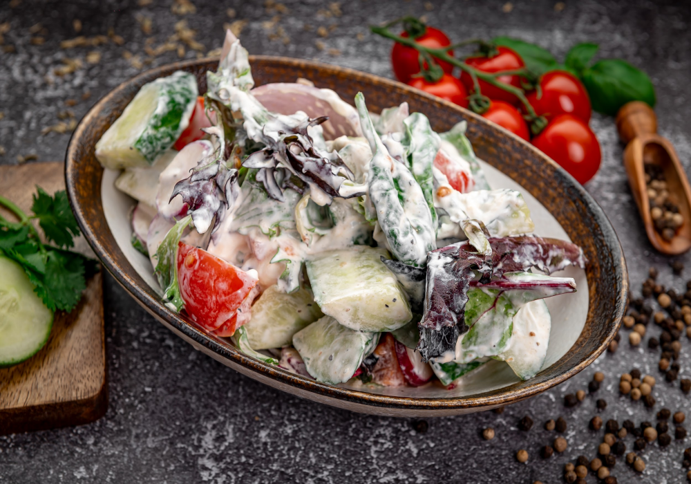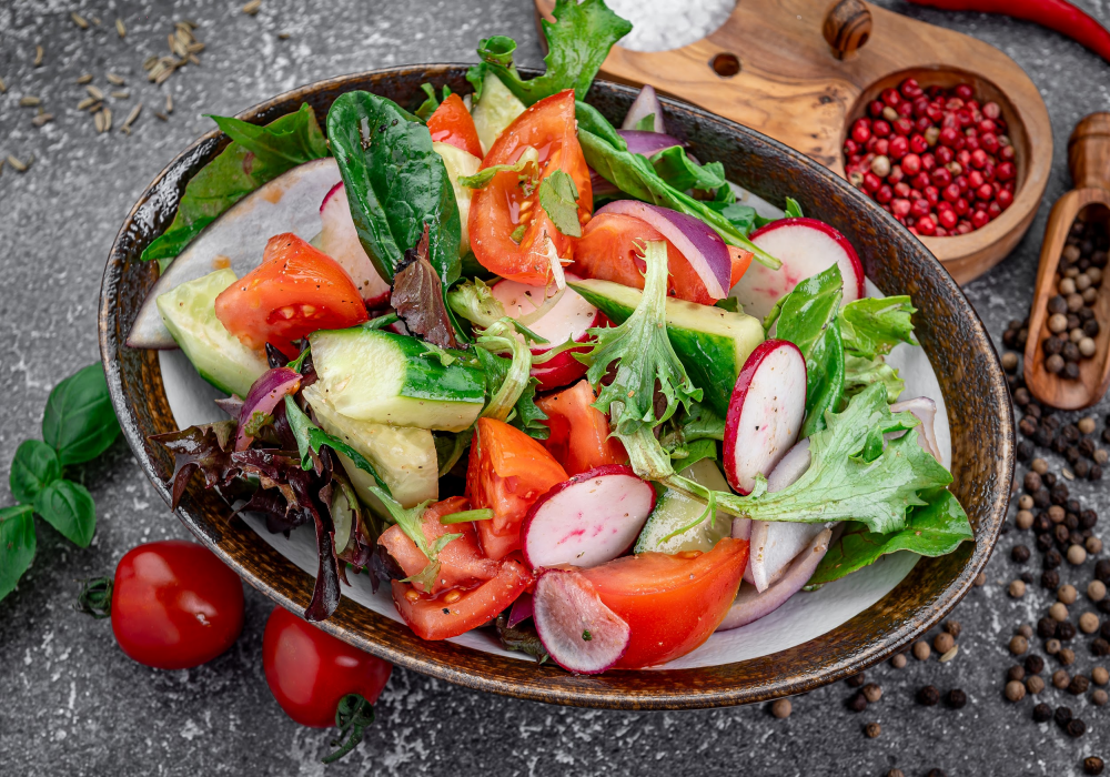 1Cucumber, sweet tomato, onion, mix salad, radish
