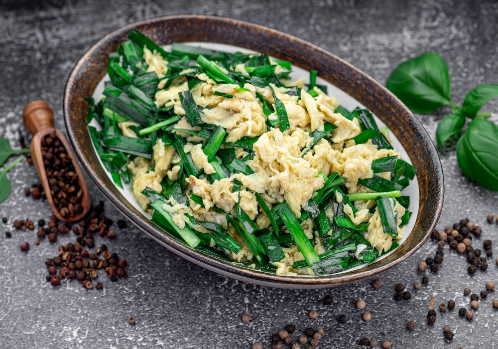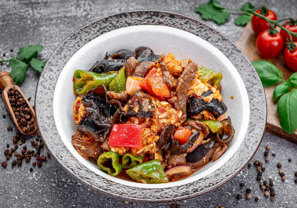 1Stir fried meat with eggs, black mushrooms, vegetables & sauces