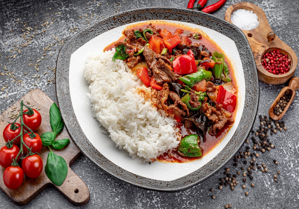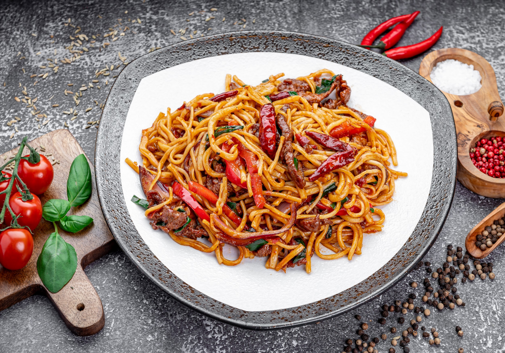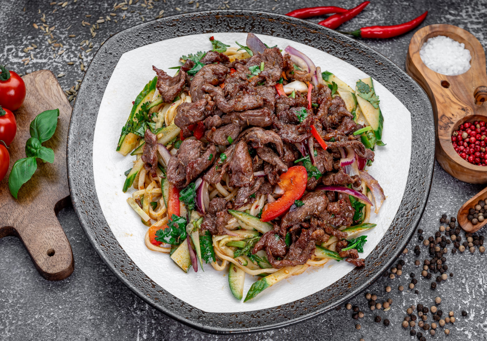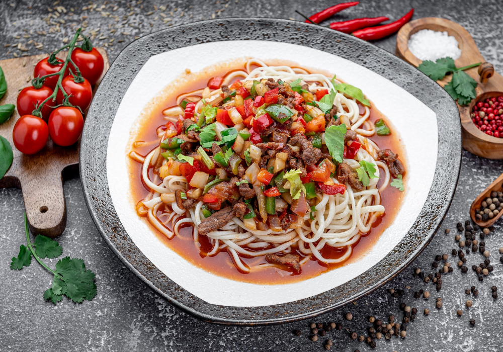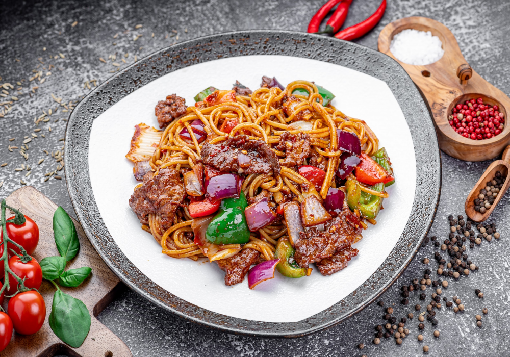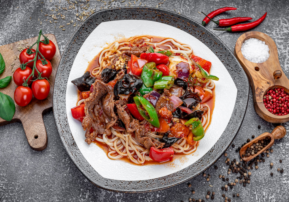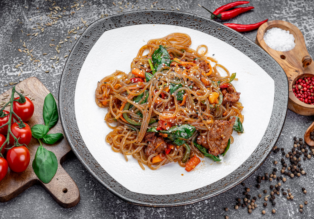 1Sweet potato starch noodles with stir fried beef, vegetables and brown rise red pepper paste