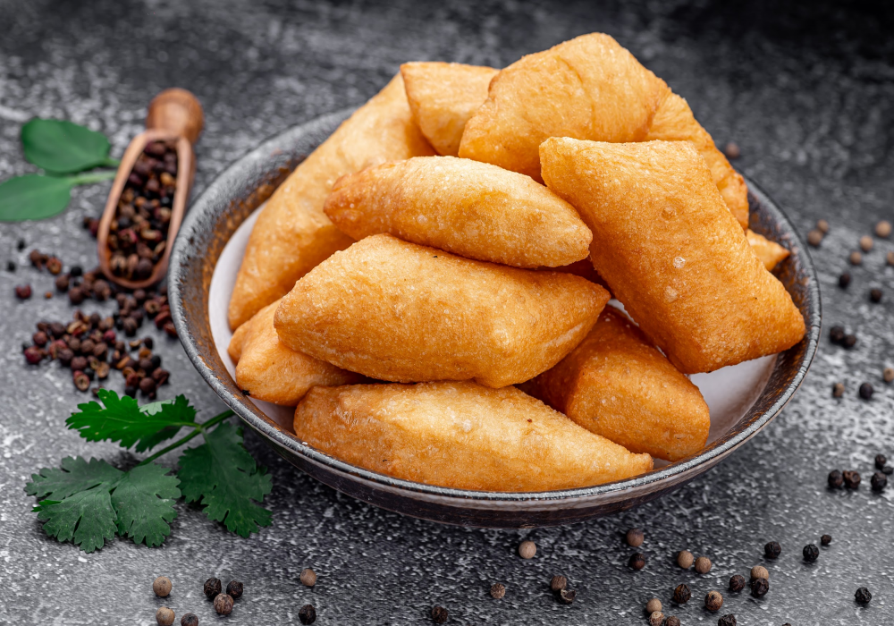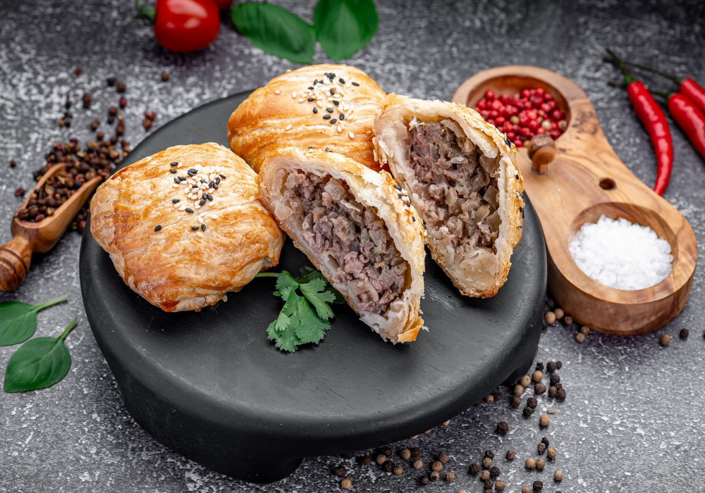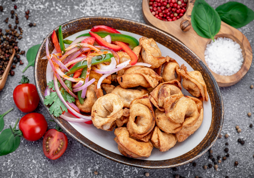 1Tender wrappers stuffed with ground beef or spinach & seasoning. Deep fried to crispy