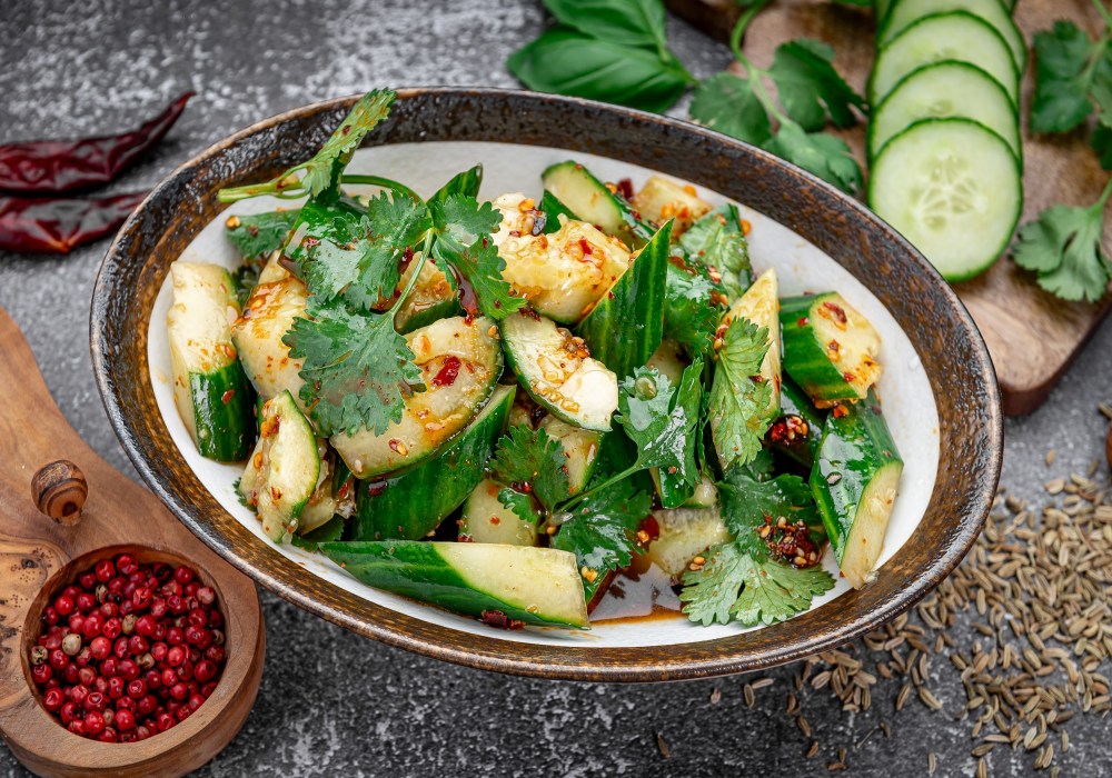 1Sour spicy cold noodles, cucumber, stir fried lamb & cumin, red pepper, cilantro